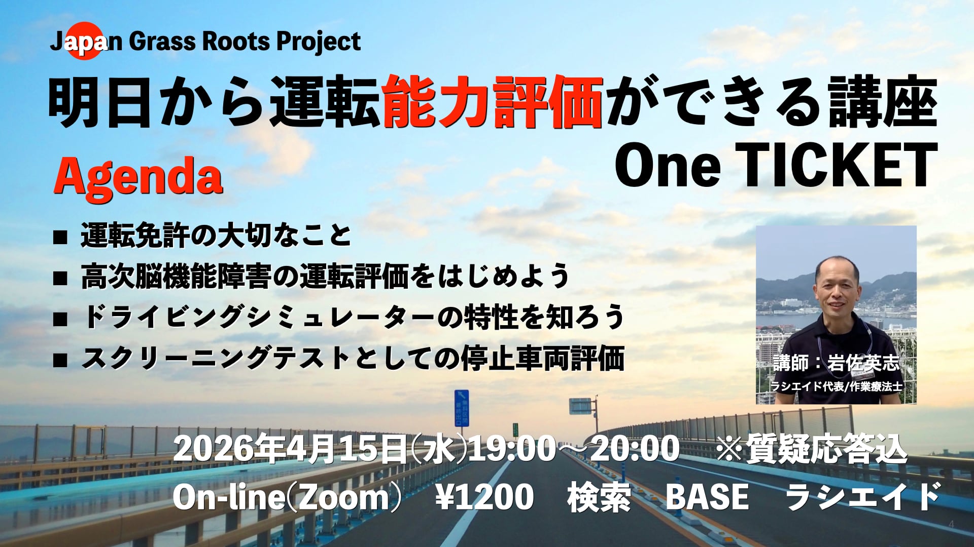 この貴重な出会いとディスカッションの中で体感できたことをOn-line講座でお伝えさせていただければと考えています。本講座は、運転能力評価のトップダウン的思考を基に、障害と運転の影響、机上検査の考え方、ドライビングシミュレーターの活用、スクリーニングテストとしての停止車両評価の概要をお伝えいたします。